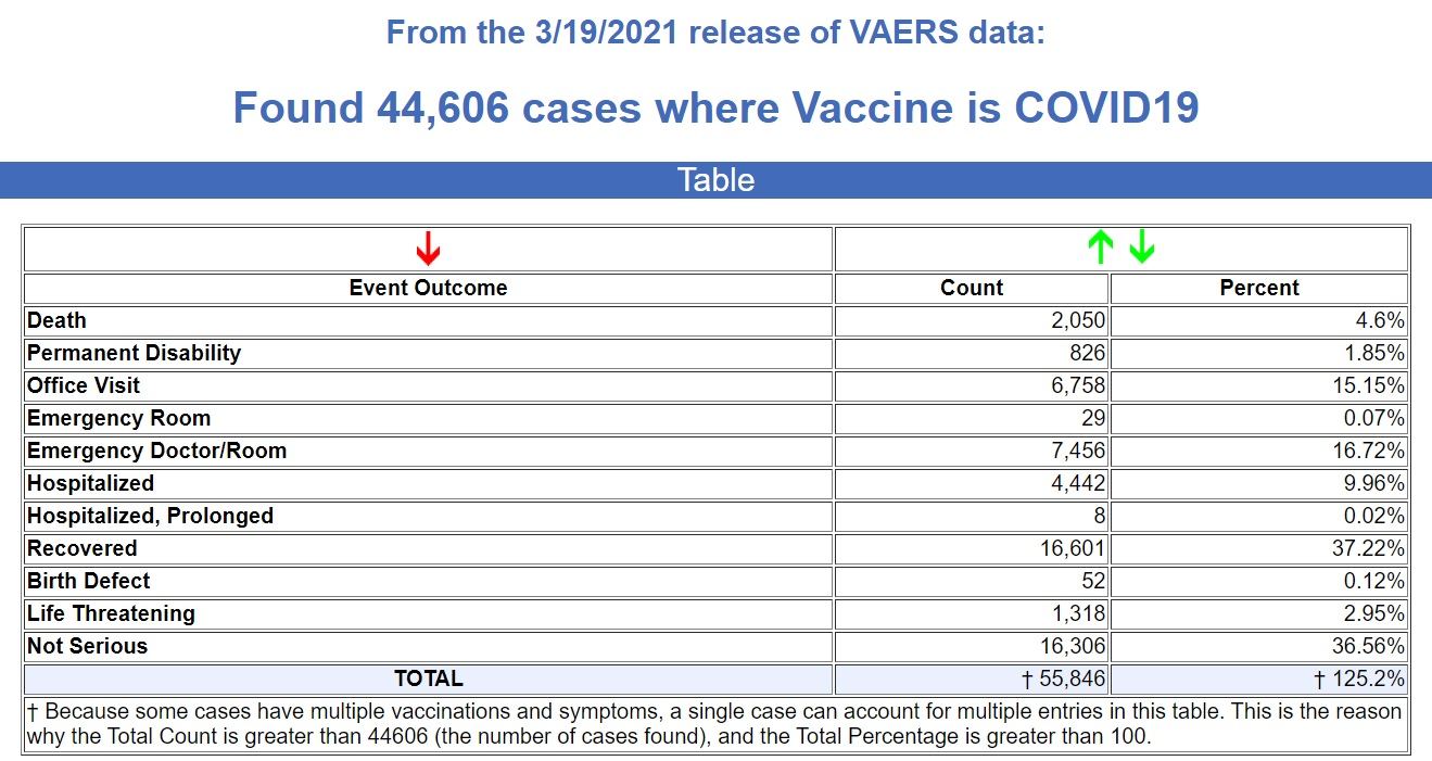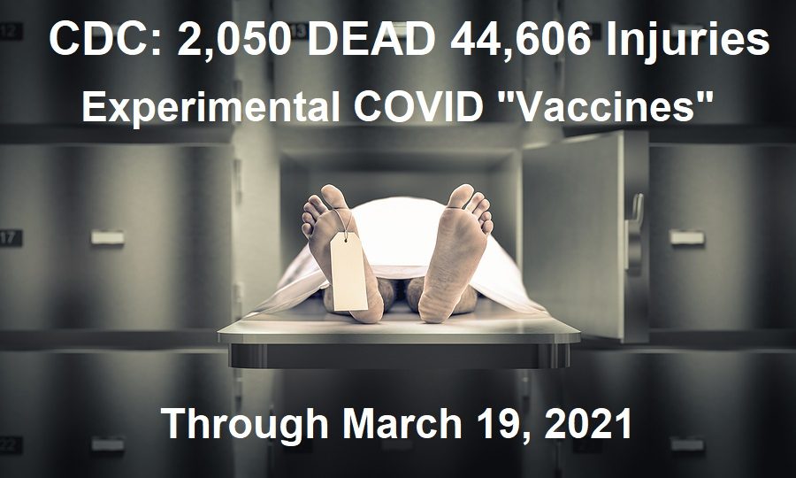 The data released by the CDC today goes through March 19, 2021, with 44,606 recorded adverse events, including 2,050 deaths following injections of the experimental COVID “vaccines.”