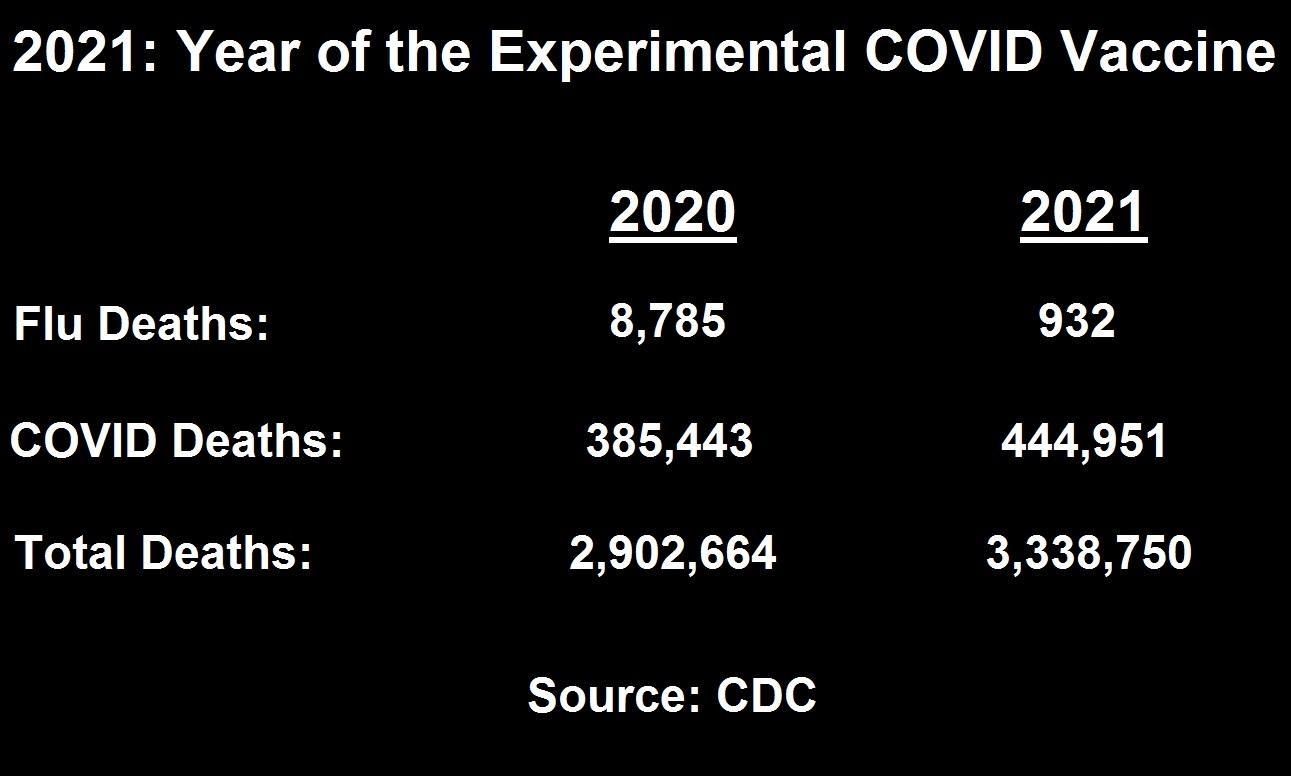 2021: COVID Deaths Increase, Flu Deaths Disappear, 400,000+ More Total Deaths than 2020